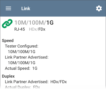 EZ Wired displays the progress of each test step using color-graded status icons—green for success, yellow for warning conditions, and red for failures. All information previously shown in the Switch app is now presented on the main EZ Wired screen, including speed, duplex, and port details, as well as PoE information (when PoE testing is enabled), or SFP information when available.