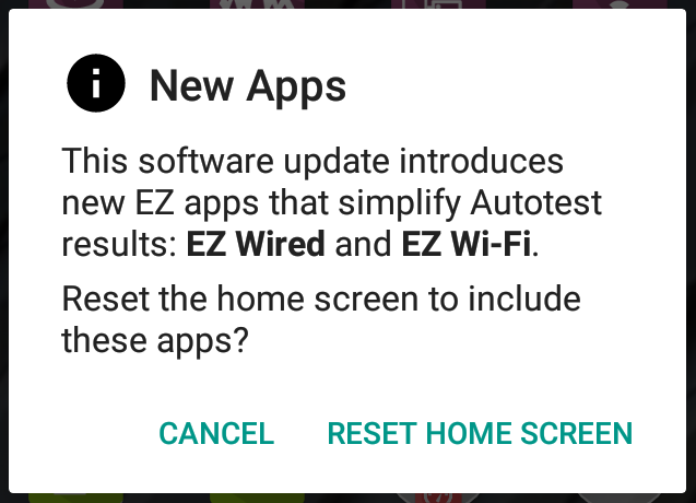 All testers now include updated app icons, including the new Link-Live icon and the EZ test apps. The exact app set varies by model. After installing version 2.9, you will be prompted to reset your home screen to the default layout, so the new apps are displayed.