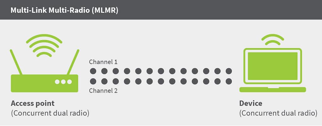 • Multi-Link Multi-Radio (MLMR) – When using MLMR both bands can be used concurrently to enable faster speeds through aggregation. This allows Wi-Fi 7 to technically double your throughput by sending half of the data through one band, and the second half via a second band. Using the shipping analogy again, it’s like doubling the number of packages you would be able to deliver if you used two trucks instead of one (each one loaded with different packages).