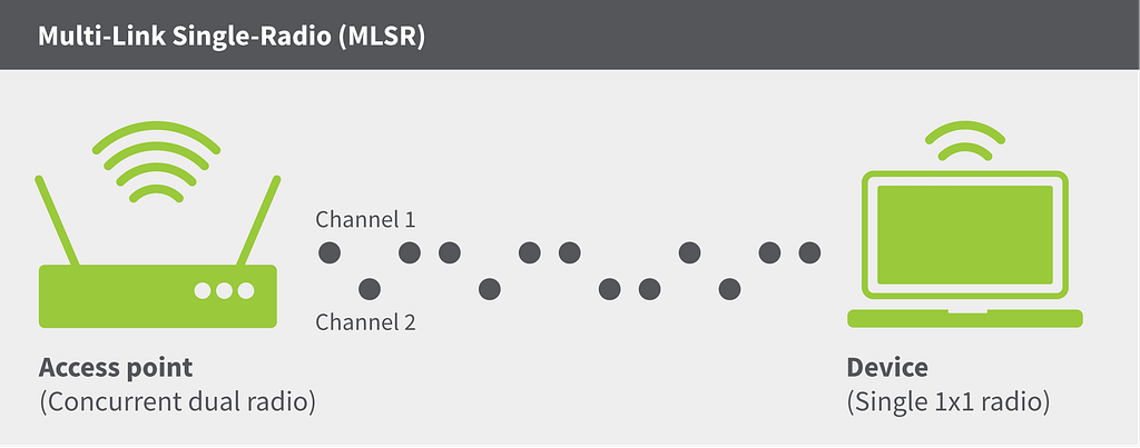 • Multi-Link Single Radio (MLSR) – When using MLSR a device with a single 1×1 radio can transmit or receive on one band at any given time. The device switches dynamically between bands based on congestion or interference, improving reliability without needing multiple radios. It’s like changing lanes while driving along a busy highway. If there is too much traffic on one lane you can move to a different one.