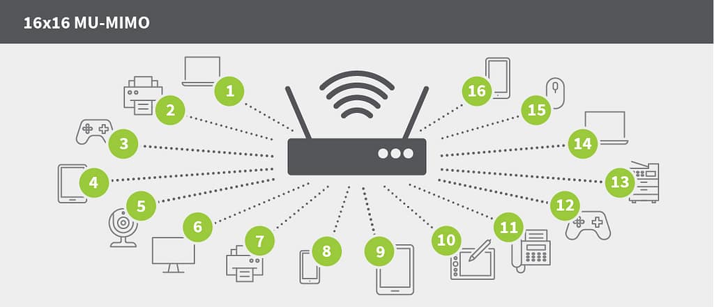 • 16×16 MU-MIMO – Having an AP or home router with 16 antennas may sound promising as it would indeed help increase Wi-Fi network throughput, but it’s likely we won’t be seeing many of them in the real world. The main reason being the form factor; just imagine how big an AP or home router will need to be to fit 16 antennas (more if they are external antennas.) As it is, APs with 8 antennas could be considered as being huge already. And, what about client devices? Well, most client devices are expected to continue to include only 1 or 2 antennas because of both form factor (limited space inside phones or tablets) and power requirements (limited battery life.)