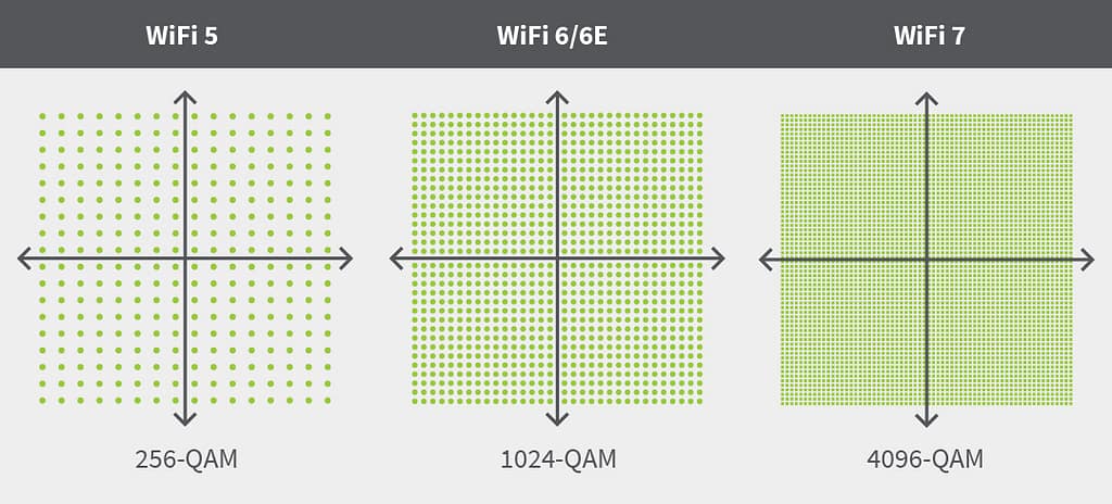 4K QAM – With Wi-Fi 7 we will get a new 4096-QAM modulation option, which enables Wi-Fi signals to embed greater amounts of data more densely when compared to the 1024-QAM supported by Wi-Fi 6/6E (it’s like being able to pack more stuff into a box that was already full by reorganizing what was inside it). This improvement will allow Wi-Fi 7 devices to transmit 20% more data at a time, which helps to increase throughput.